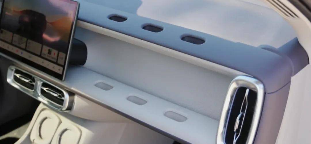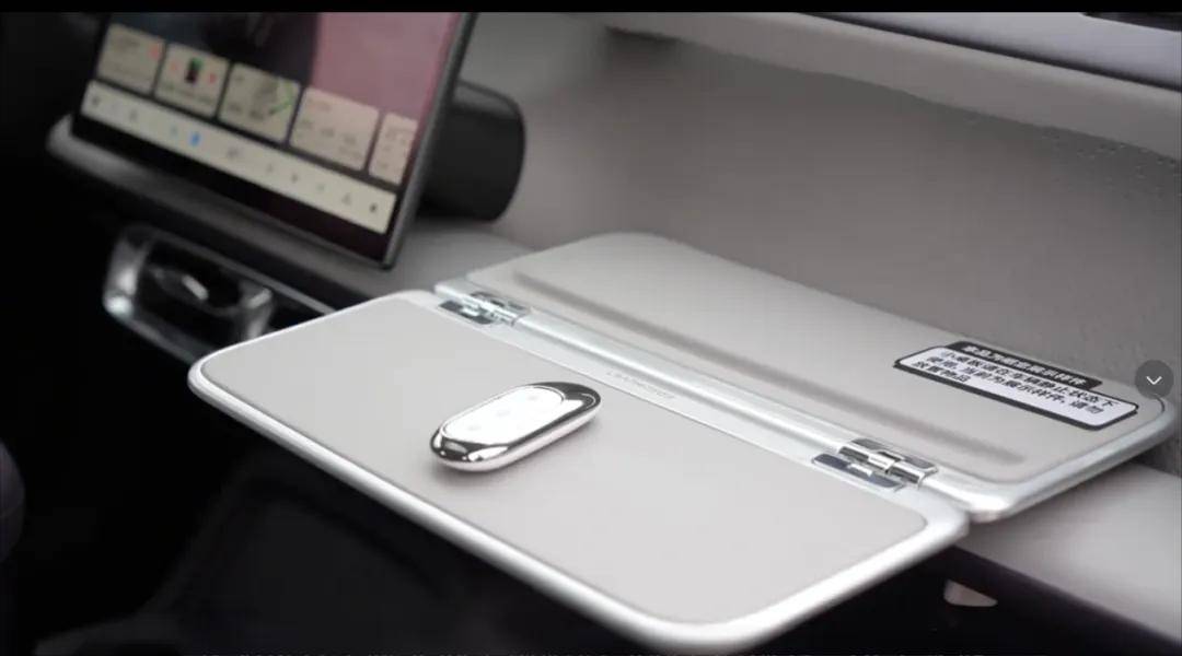 奇思妙想的小设计上,虽然没有配备给副驾一块娱乐屏,但为了照顾到副驾的乘坐体验,在上方设计了六个魔术拓展坞,有点类似家里的洞洞板,可以让自己去DIY,根据自己的喜好和需求去设计,比如说随车赠送的的小折叠板,面积不大,和飞机上的小桌板差不多,用来放个电脑,临时办公还是很不错的。