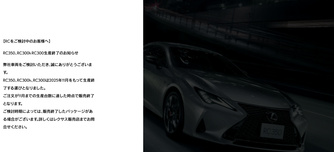 “感谢您对我们车型的关注。IS 500、IS 350、IS 300h(四驱版)、IS 300、RC 350、RC 300h及RC 300的生产将于2025年11月结束。一旦订单量达到11月的生产配额,销售将随之终止。根据您考虑购车的时间不同,部分配置套餐可能已无法提供。详情请咨询雷克萨斯经销商。”