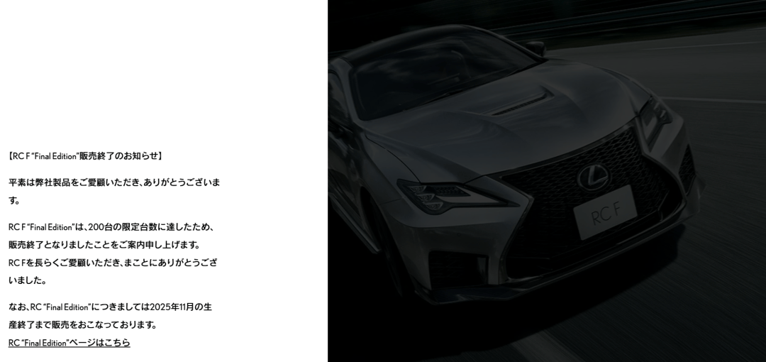 “感谢您一直以来对我们产品的支持。抱歉通知您,RC F‘Final Edition’已达200台限量额度,目前已售罄。衷心感谢您对RC F的持续青睐。RC‘Final Edition’将销售至2025年11月停产为止。”