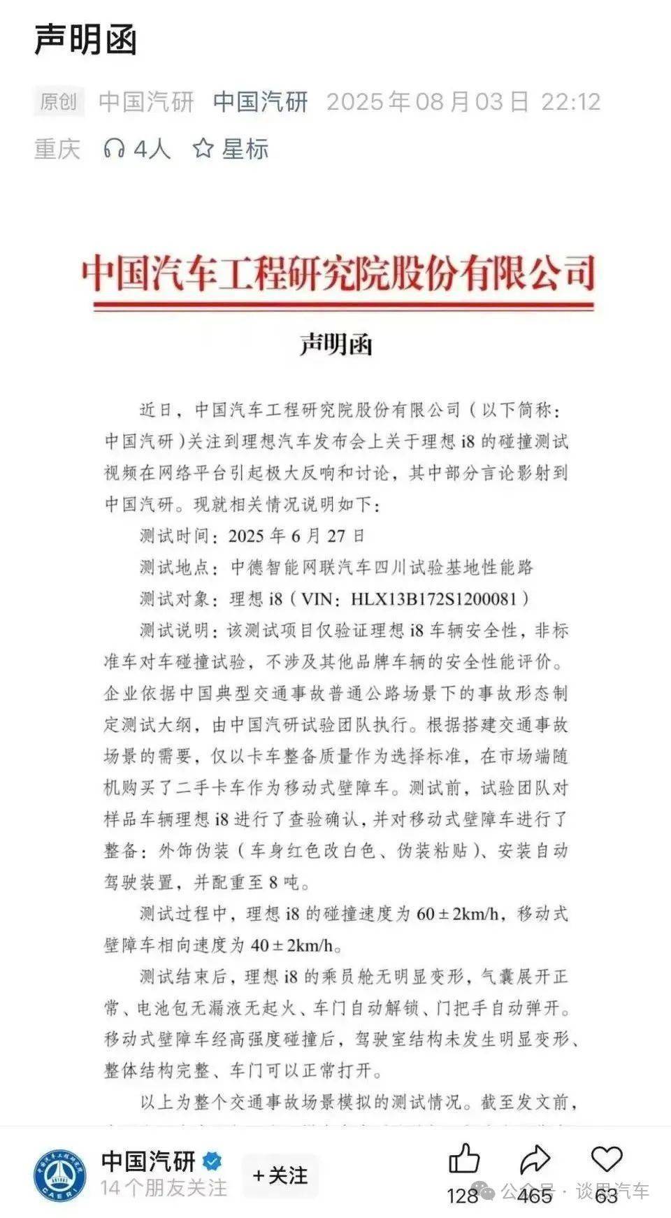 近日,中国汽车工程研究院股份有限公司(以下简称:中国汽研)关注到理想汽车发布会上关于理想i8的碰撞测试视频在网络平台引起极大反响和讨论,其中部分言论影射到中国汽研。现就相关情况说明如下