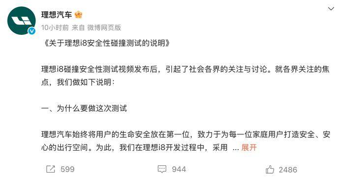 8月3日晚,理想汽车官博发布《关于理想i8安全性碰撞测试的说明》