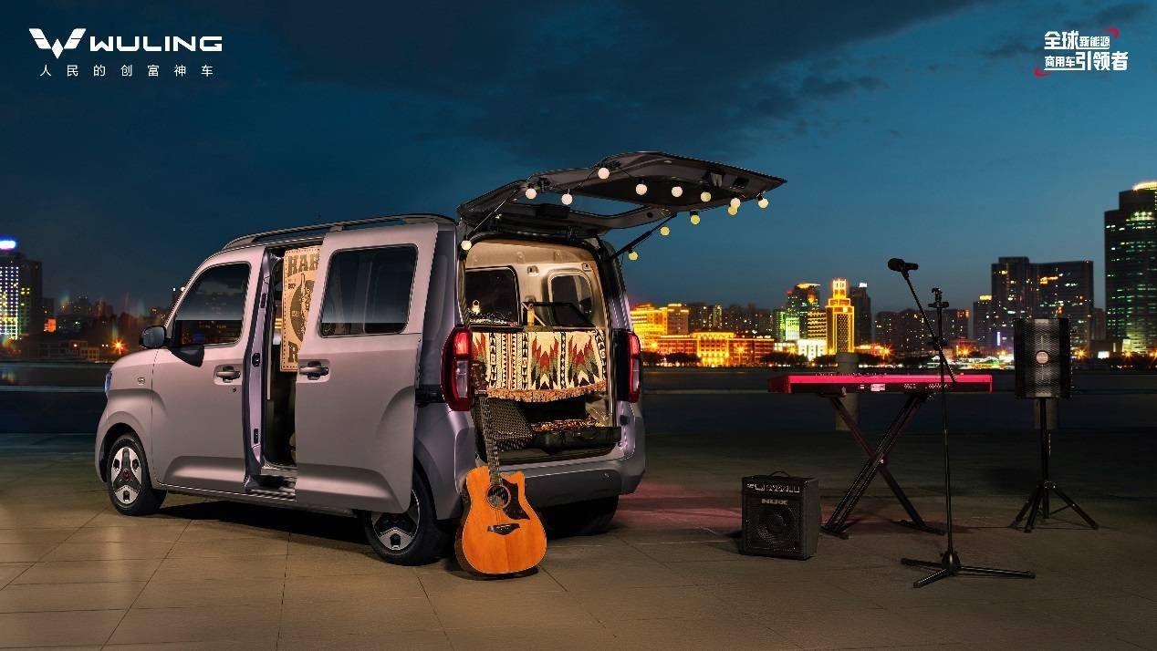 并且 全车预留 20 处 M6 标准螺纹安装孔,提供丰富的拓展储物空间;此外,五菱之光 EV 同级创新搭载对外放电功能,可以满足各类摆摊需求。
