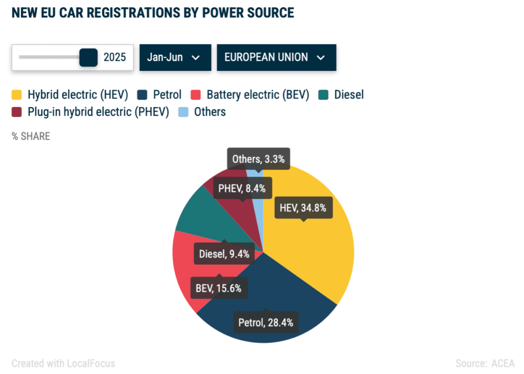 在欧洲,根据欧洲汽车工业协会(ACEA)数据,从2024年11月开始,HEV在市占率上实现了对汽油车的超越,成为欧洲汽车销量最大的类别。今年上半年,HEV市占率更达到34.8%,如果再加上PHEV的份额(8.4%),“广义混动”在欧洲市场的占比高达43.2%,相当于纯电动车份额(15.6%)的2.7倍有余。
