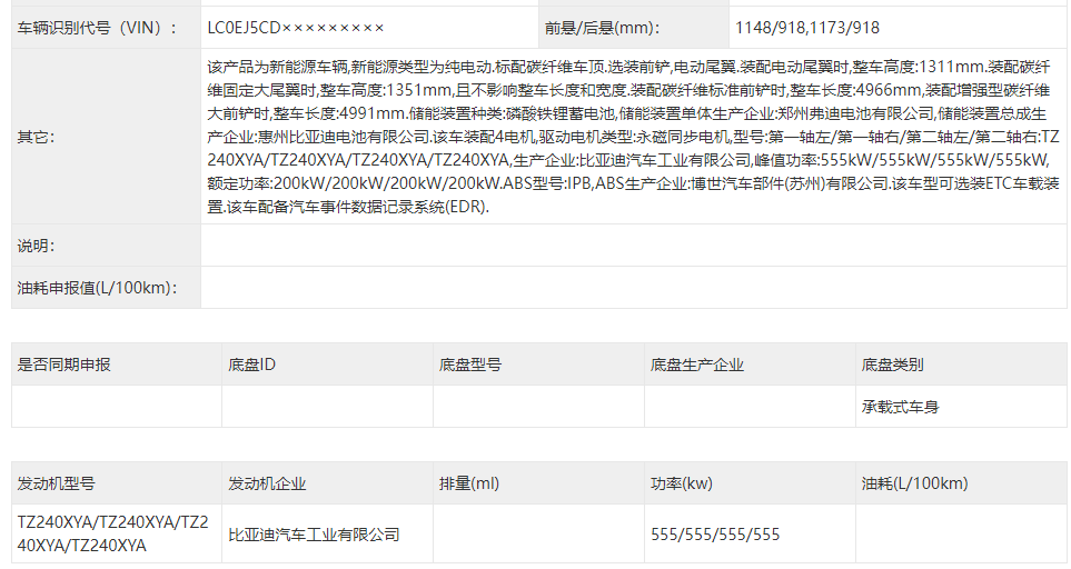 日前,在第398批《道路机动车辆生产企业及产品公告》新产品公示中,仰望U9赛道版申报信息曝光。新车搭载了单个电机555kW的四电机驱动系统,总输出功率高达2220kW,约为3019马力,同时,新车还将标配碳纤维车顶和碳纤维固定大尾翼,并且可以选装电动尾翼。