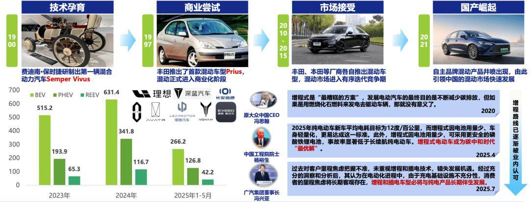 混合动力汽车最早可追溯至1900年保时捷研制的第一台串联混动原型车,1997年发布的普锐斯开启了丰田混动的统治时代,2021年自主品牌混动产品井喷出现,由此引领中国的混动市场快速发展;早期插混和增程路线曾一度被业内质疑,但凭借其在能耗、续航、安全等方面的优势,插混及增程路线已逐渐成为市场主流。