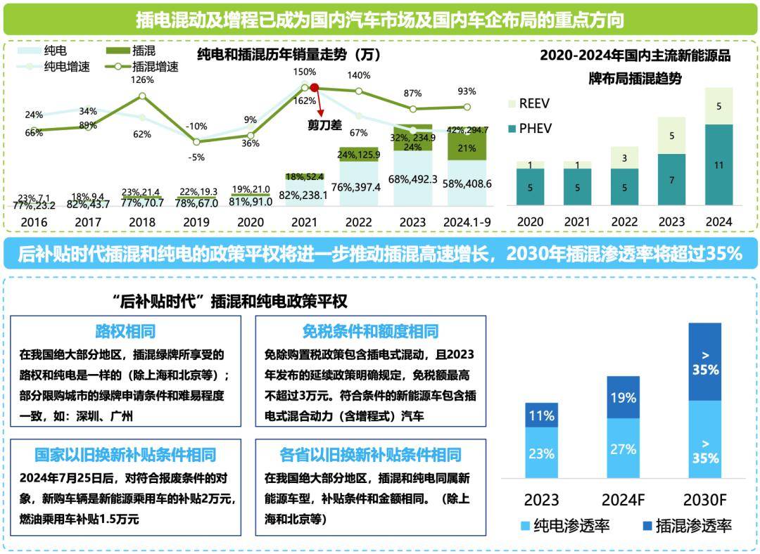 朱兴佳表示,“后补贴”时代,插混和纯电享有同样的路权、免税条件、以旧换新等政策红利,预计将进一步推动插混渗透率的增长,预计到2030年,插混渗透率将超过35%。