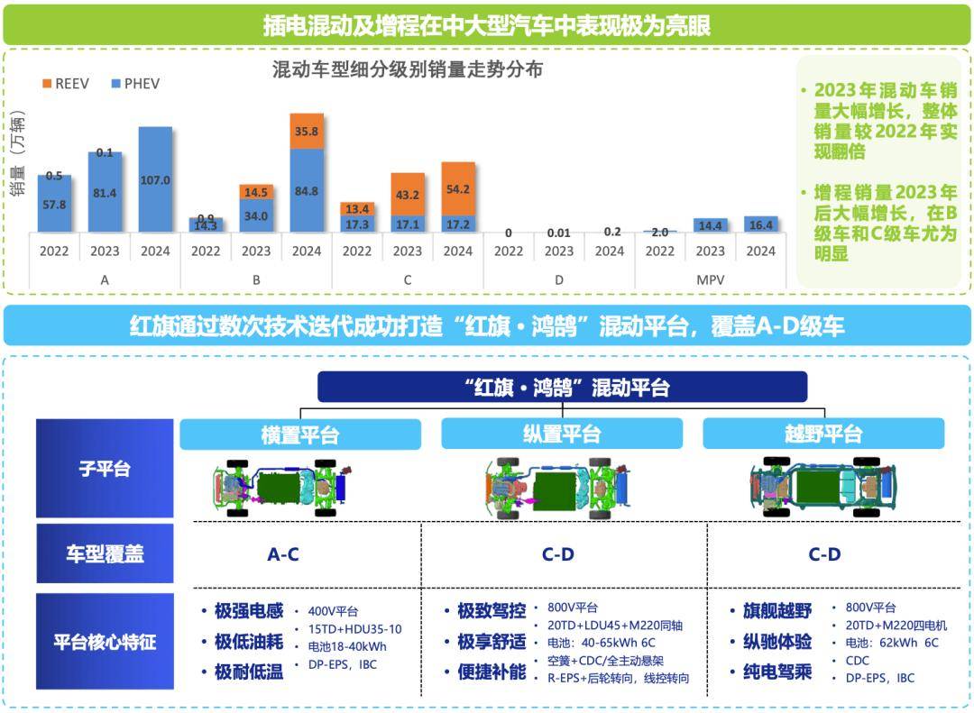韩令海表示,“红旗通过多次技术迭代,成功打造出覆盖A-D级车的‘红旗·鸿鹄’混动平台,推动红旗产品全面升级,加速实现新能源跃迁发展。”