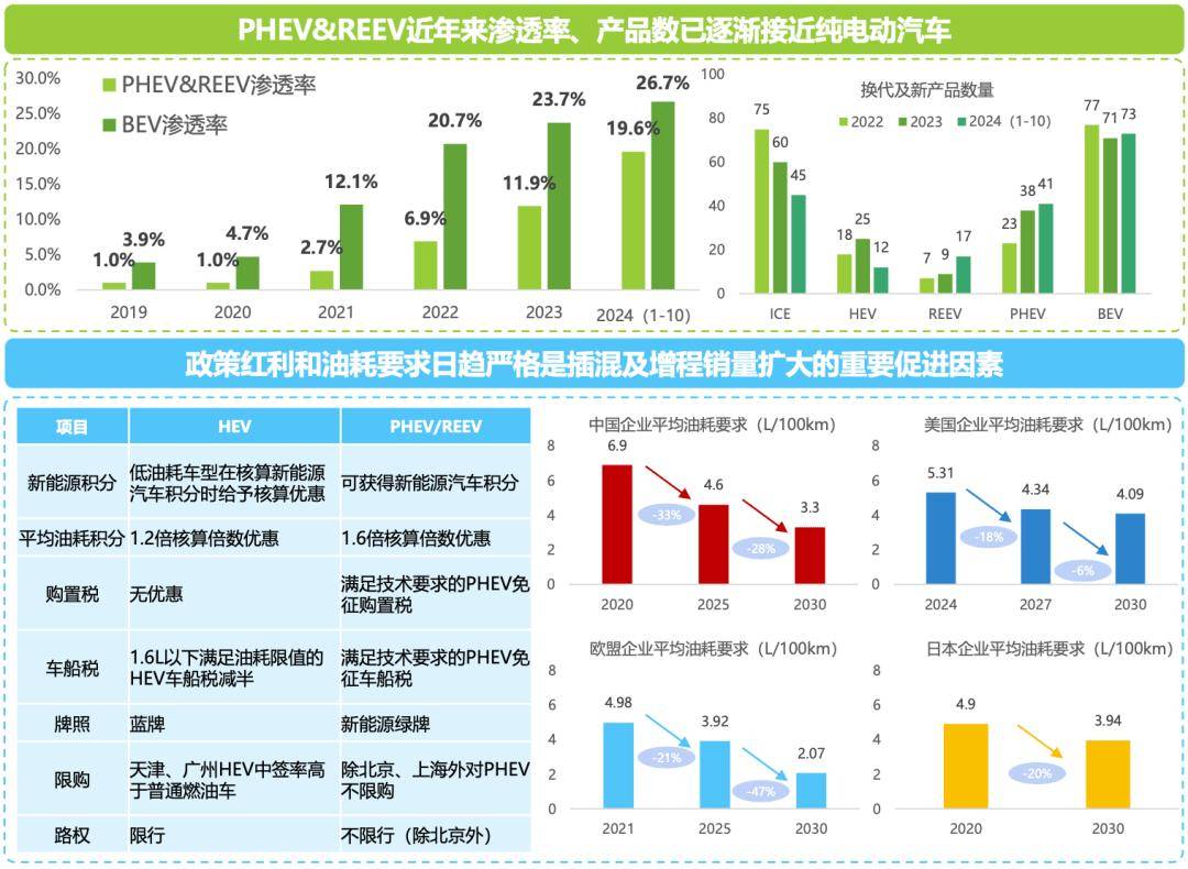 北汽研发总院混动中心主任兼高效动力部部长范子柱认为:“插混及增程(PHEV/REEV)相较混动汽车(HEV)能享有新能源汽车积分、平均油耗积分、购置税、车船税等更多政策优待,全球主要汽车市场对平均油耗要求的日益严格也使燃油车市场进一步缩小,插混及增程份额逐渐增加。目前,插混及增程渗透率已由2019年的不足1%增长至2024年(前十个月)的19.6%,接近纯电动汽车,产品数量上也呈快速增长态势。”