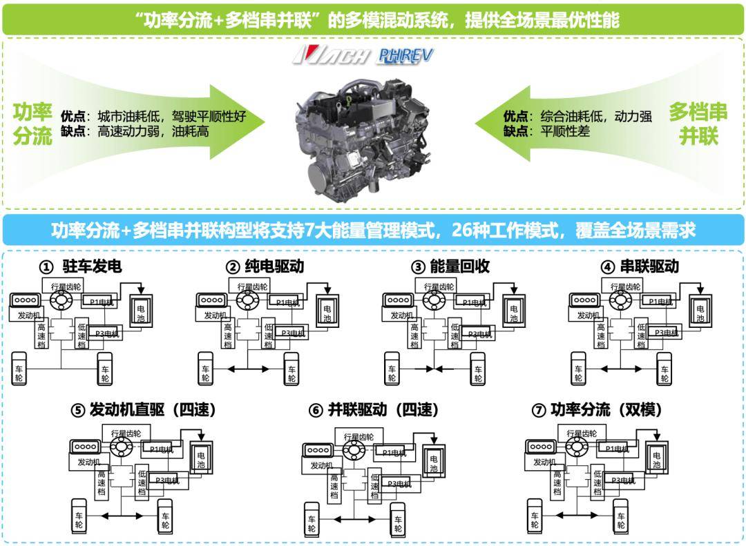 东风汽车公司研发总院乘用车动力中心动力总成技术总师张社民认为,随着混动总成效率提升,HEV/PHEV碳排放降达到与BEV相当程度。张社民表示:“东风开发了全球首个融合‘功率分流+多档串并联’的多模混动系统,集合各种混动车型优势,提供全场景最优性能,通过驻车发电、纯电驱动、串联驱动、发动机直驱(四速)、并联驱动(四速)、功率分流(双模)等7大能量管理模式,26种工作模式,覆盖全场景需求。”