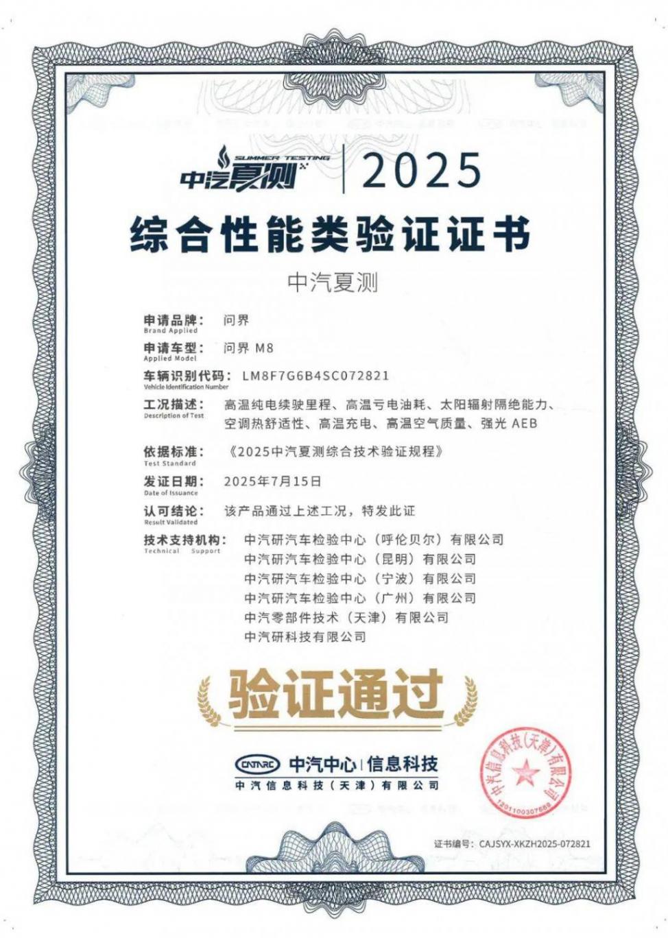 当车辆在烈日下暴晒两小时后,内饰挥发物会呈指数级增长。作为中汽中心"零甲醛"认证车型,问界M8在此次夏测的高温空气质量测试中同样取得出色成绩。