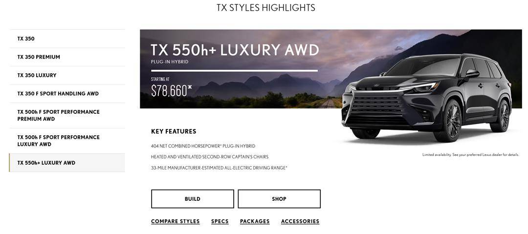动力方面有3个配置,TX 350搭载2.4升涡轮增压发动机,最大功率279马力,最大扭矩430牛·米,匹配8速手自一体变速箱;TX 500h是2.4T发动机+电机,系统综合最大功率371马力,最大扭矩555牛·米;TX 550h+使用3.5L V6发动机与电机组成的插电混动系统,最大功率412马力,纯电续航里程在55km左右。