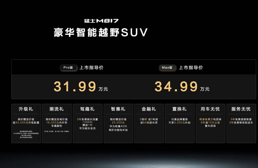 8月17日,猛士M817正式上市。新车共带来2款配置,售价分别为31.99-34.99万元。这个价格应该比此前大部分人预期的都要低,很多人之前一直猜测M817起售价也得奔着40万去,而今天看来,M817就是台理想L7的价格,从智能化到硬派SUV定来看,M817将对坦克500、豹8这样的车型发起冲击,目前来看卖相真心不错。华为乾崑ADS 4智驾和鸿蒙座舱5绝对是两大核心卖点。