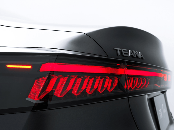 车身侧面遵循0.618黄金比例美学公式,修长轮廓搭配19英寸金属质感多辐条轮毂,在动感与优雅间找到完美平衡。尾部设计同样亮点十足:贯穿式尾灯组内镶嵌11枚宝石灯体,配合可发光的NISSAN光标,夜间点亮时宛如星河流动,辨识度与精致感兼具。值得关注的是,尾标正式回归"TEANA"经典命名,这一举措是对2004年国产初代车型的致敬。