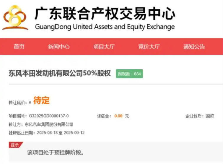 近期广东联合产权交易中心官网的一则预挂牌信息,揭示了汽车产业转型大潮中一个标志性事件。东风汽车集团宣布将出售其持有的东风本田发动机有限公司50%股权。