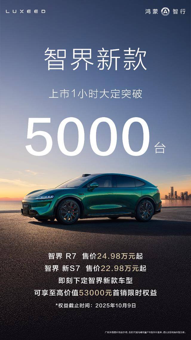 智界R7与智界新S7以全面进阶实现产品力的持续突破,不仅填补了25万级市场“家用”与“驾控”的细分需求空白,更以越级产品力打破传统竞争格局。在新能源汽车市场加速迭代的当下,新款智界双子星站在1小时大定破5000台的起点上,依托华为技术赋能与品牌2.0战略背书,有望在接下来的市场竞争中持续领跑。