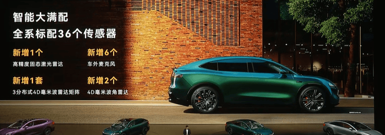 传感器方面,智界R7全系标配 36 个传感器,新增 1 个高精固态激光雷达、1 套 3 分布式 4D 毫米波雷达矩阵、2 个 4D 毫米波角雷达。