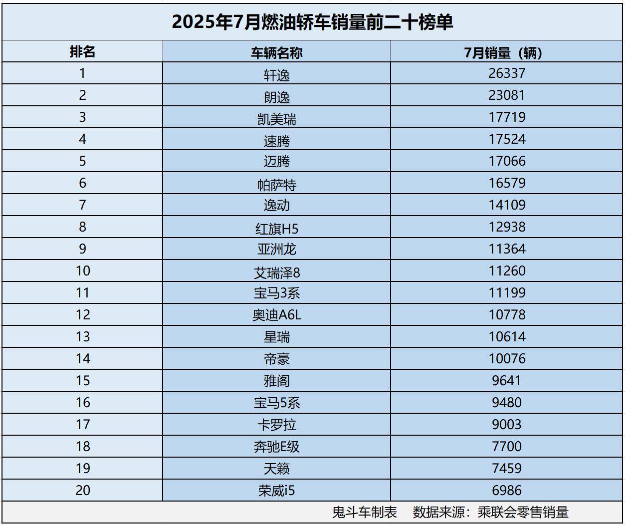 这一点,在销量上体现得更为明显,7月乘联会零售销量出炉,鬼哥整理出7月燃油轿车销量排名前二十的榜单,接下来,看看哪些燃油轿车榜上有名?谁的表现更为出众?