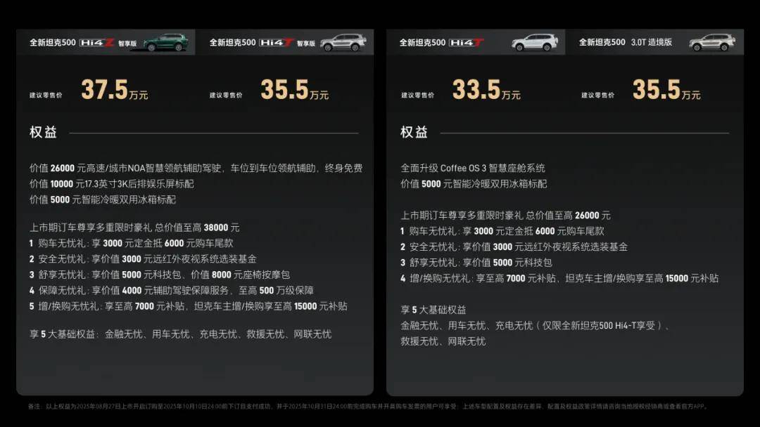 坦克500 Hi4-T定位强越野,搭载2.0T+9HAT,强悍的动力及非解耦四驱结构,能应对更多极限越野场景;坦克500 Hi4-Z定位泛越野,搭载2.0T+前后双电机,匹配全球最短纵置3挡混动变速箱,WLTC纯电续航达到201km,满足用户“可城可野”的需求;全新坦克500 3.0T,大排量双涡轮增压为专业越野用户提供纯粹硬核动力。