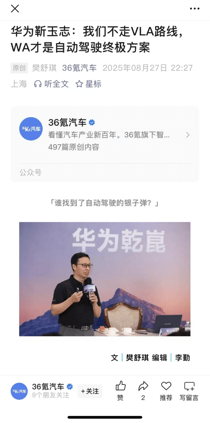 华为靳玉志:华为不走VLA路线,WA才是实现真正自动驾驶终极方案