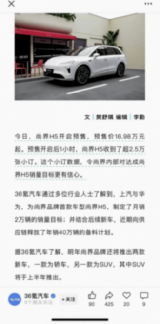 消息称尚界H5月销冲2万!明年计划再推两款新车