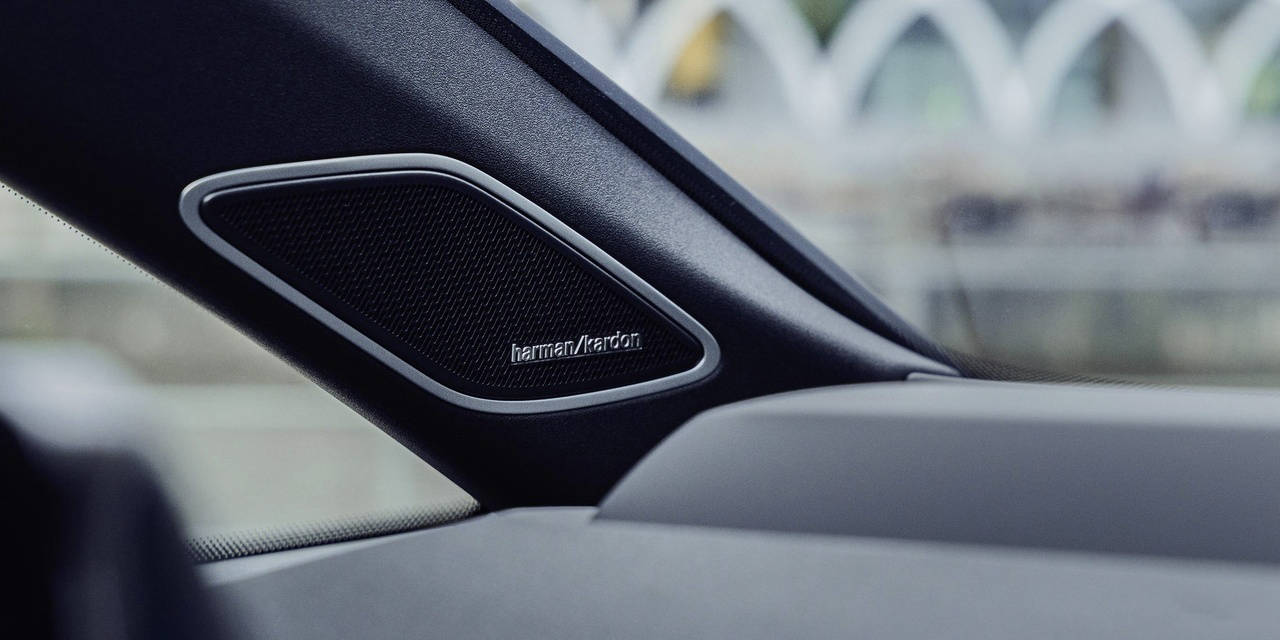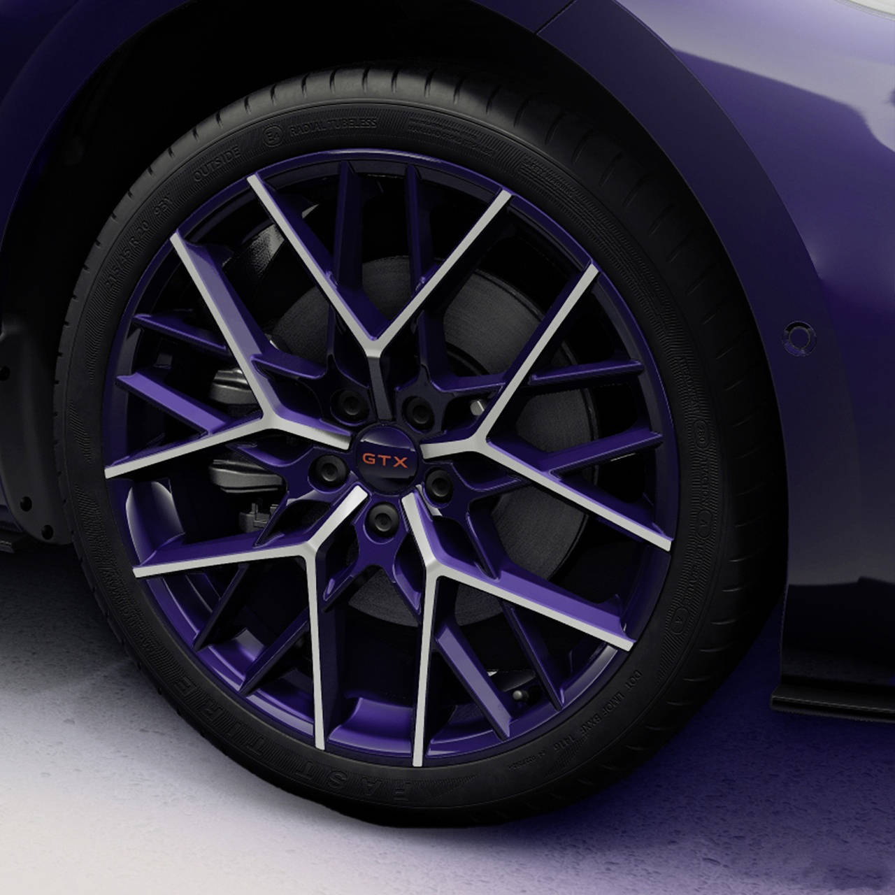 车尾扰流板采用 90 年代的标志,20 英寸 Locarno 轮毂搭配超紫外金属漆与高亮饰面,并以 GTX 红色轮毂盖收尾。打开车门时,象征火焰与冰的图形灯光会分别投射在驾驶座和副驾驶座的地面上,增添视觉乐趣。