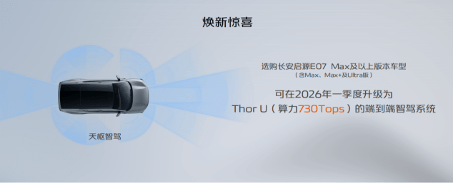 值得一提的是,品牌方还为消费者带来“焕新惊喜”。基于长安汽车全栈自研的SDA天枢架构所具备的“硬件可插拔”能力,长安启源E07 Max及以上版本车型(含Max、Max+及Ultra版),预计将在2026年一季度升级搭载高算力Thor U(算力730Tops)的端到端智驾辅助系统,让用户畅享更智能、更安全的城区智驾体验。