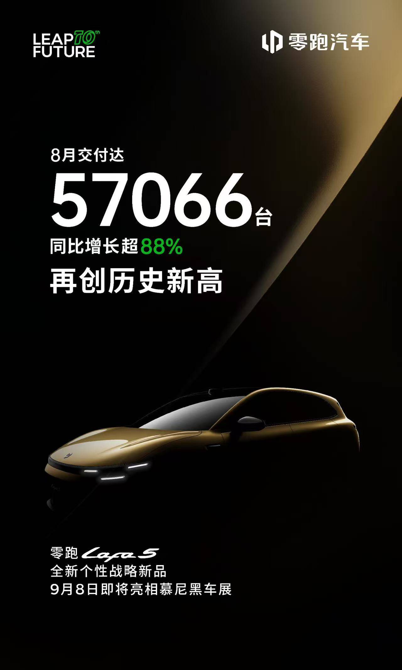 9月1日,零跑汽车公布最新交付数据:8月,零跑汽车全系交付再创新高达57066台,同比增长超88%,连续六个月稳居新势力品牌月销领先位置。